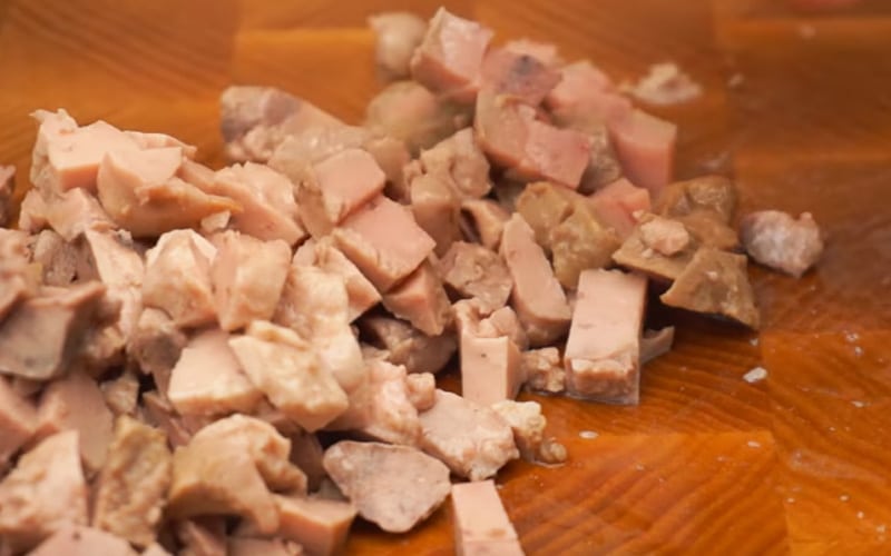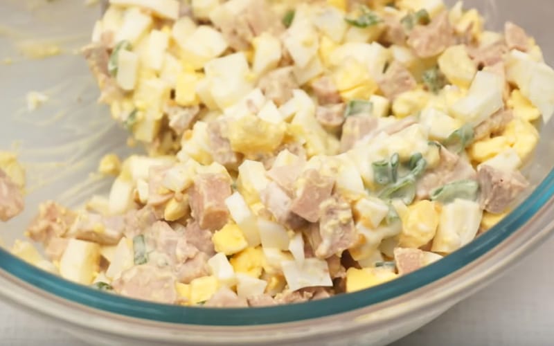 - Для начинки смешиваем печень трески, лук, яйца, горчицу, майонез и соль.